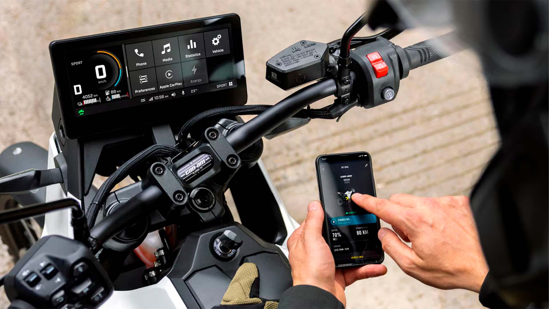 Все модели оснащены TFT-дисплеем 10.25 дюйма с поддержкой Apple CarPlay и фирменным приложением BRP GO. Дисплей отображает скорость, заряд батареи, запас хода, навигацию и уведомления от смартфона. Приложение BRP GO позволяет удаленно мониторить процесс зарядки, планировать время начала зарядки и предварительно кондиционировать батарею перед поездкой.